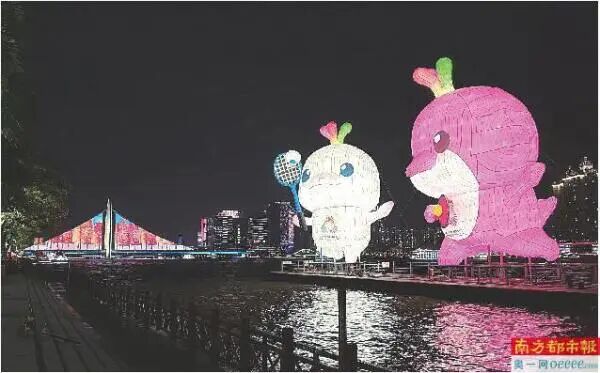 广轻控股集团景观设计制作团队以岭南文化为底蕴,融合现代设计语言,打造了多个具有标志性意义的城市艺术节点。在海心沙,高达15米手持羽毛球拍与乒乓球拍的悬浮吉祥物“喜洋洋”与“乐融融”,就是以岭南非遗“彩扎”技艺匠心制作——竹篾为骨、色纸为衣,既传承广府传统工艺,又结合现代结构与光影技术,在珠江夜景中熠熠生辉,成为展现广州文化活力与创意风采的都市新符号。