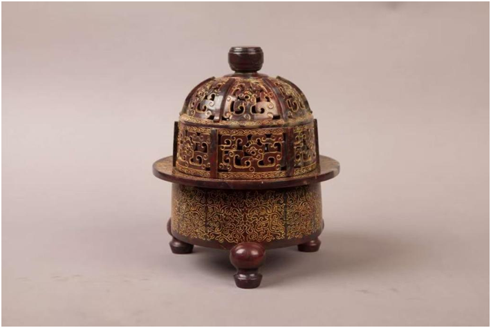 创作理念:作品艳红处作层林尽染之态,黄润肌理雕山水亭台、闲游人物,借福黄石的祥瑞底色衬鸡血红的鲜活韵致,表达了逸情山水、闲适自洽的生活意趣。▌《鎏金龙纹熏炉》