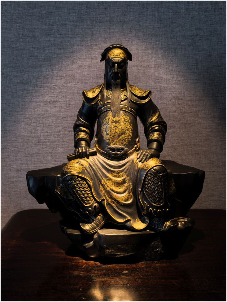 创作理念:作品分为炉盖、炉身、炉底三部分组成,炉盖与炉身带插角以六组變龙纹镂空雕刻而成,龙图案规整统一,其神态自若,身形灵动。炉底和炉底圈口以线刻缠技纹图案,线条流畅飘逸,生机勃勃。▌《关圣帝君》