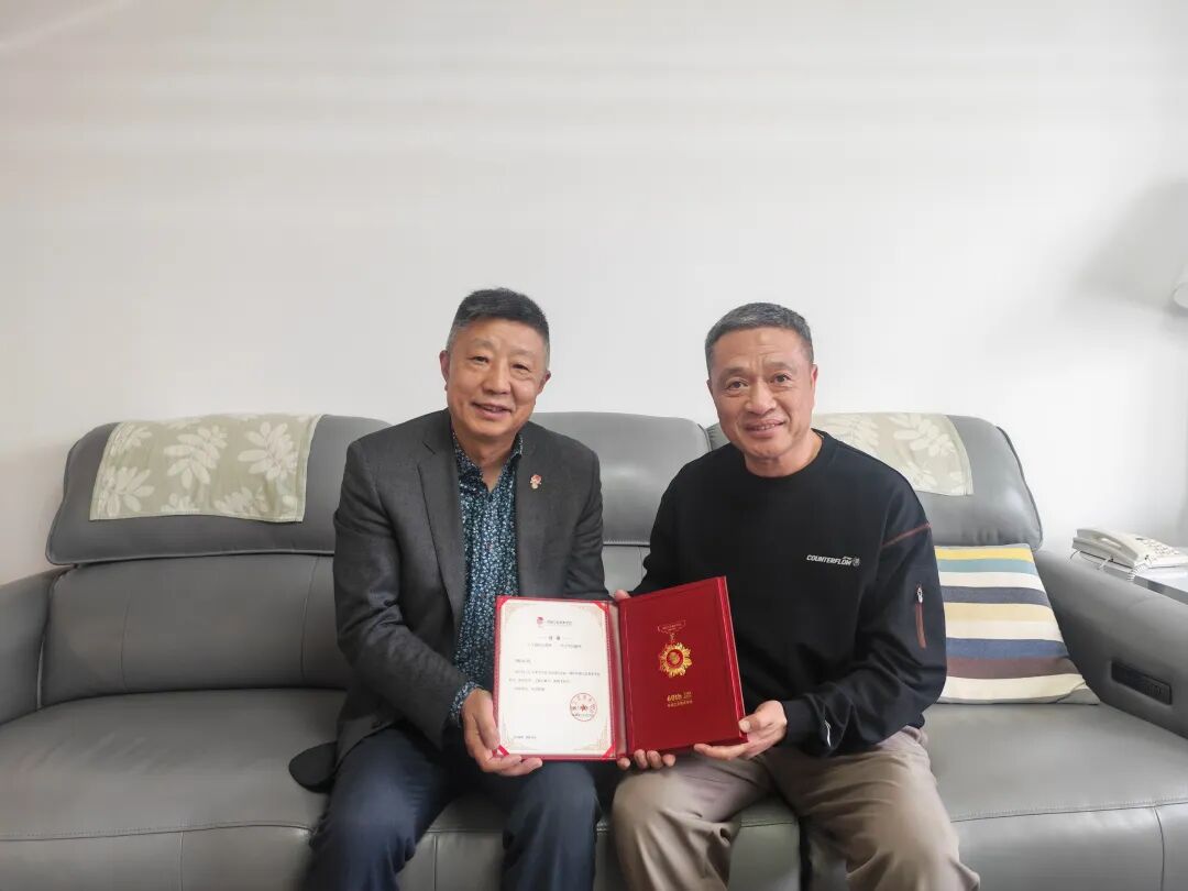 2026 年4月21日,中国工艺美术学会党委书记、理事长才大颖,在京专程探望原轻工总会副会长、中国工艺美术学会第二届理事会理事长傅立民亲属,为其颁发中国工艺美术学会60周年证章。中国工艺美术学会副秘书长孙瑞陪同参加颁发活动。才大颖理事长一行来到傅立民之子傅群住处,介绍了中国工艺美术学会开展60周年证章颁发活动的情况。深切缅怀傅立民为推动我国工艺美术发展做出的突出贡献,才大颖理事长表示,中国工艺美术学会60周年证章的颁发,既代表全体学会会员对傅立民的敬意,更是对后辈从业者的激励和鞭策。傅群代表家人感谢中国工艺美术学会才大颖理事长专程来家中探望,深情回忆起父亲在轻工系统和中国工艺美术学会工作中的很多难忘瞬间,“60周年证章”铭刻着父亲对我国工艺美术奉献精神,值得家人珍视和传承。中国工艺美术学会党委书记、理事长才大颖向傅立民之子傅群颁发中国工艺美术学会60周年“致谢”主题证章。傅立民(1936.8—2011.7.4),曾任中国轻工总会副会长、党组成员、机关党委书记,国务院稽查特派员、中国工艺美术学会第二届理事会理事长等职,是全国政协第九届、十届全国委员会经济委员会委员。