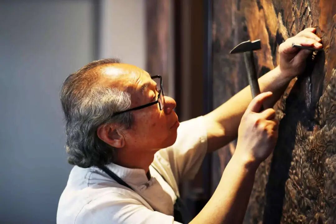 在央视舞台上,作为浙江省历史经典产业永康金属雕领军人,程育全以独创的“点铜锤丝法”,化锤为笔、以铜为纸,通过一把铜壶作品,向全国观众展示永康铜雕这一传统技艺。