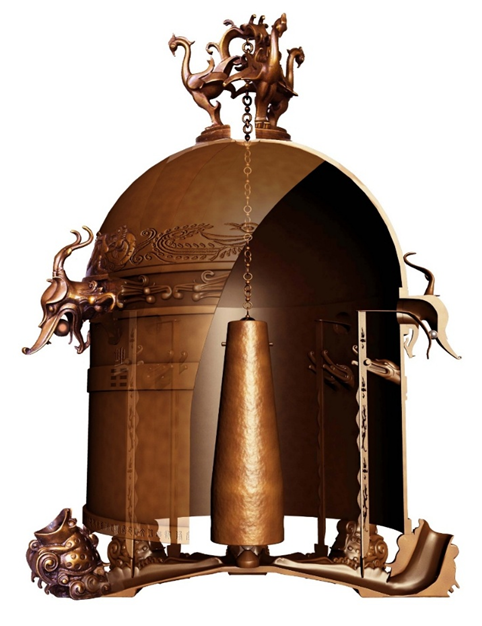 对于悬挂重锤的凤鸟设计,他大胆地把我们原来考虑的一只改为三只凤鸟,而且面朝外呈放射状、外倾。他细致地研究了汉代樽体的6个基本元素,顶盖上都会有三只凤钮。于是,把三只凤钮移动到中心,再改成硕大的风鸟是符合传统的,风鸟上身的外倾造型维系了古代樽体、圆壶一类器物在顶端的轮廓线呈侈口型的特点。后来,我们兴奋地拿给他四川三星堆出土的商朝青铜凤鸟——太阳神,尾羽确实可以直立状高高竖起!培波则用汉代凤鸟造型取代之后,终于解决了悬挂点必须有较高坐标的科学要求,实在太完满了。