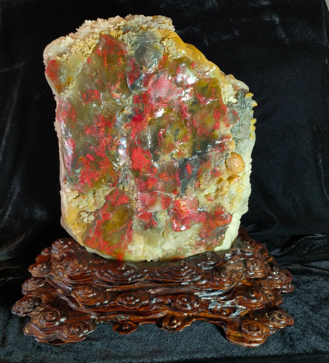创作理念:作品正面以大片块状鸡血来衬托,晚霞斜照在云端红遍山顶,深山脚下天色渐暗,主人公手持灯笼,早早地在深山口迎接友人的到来,刻画出古代文人雅士,走访好友的场景画面。▌《鸡血王龙鱼》