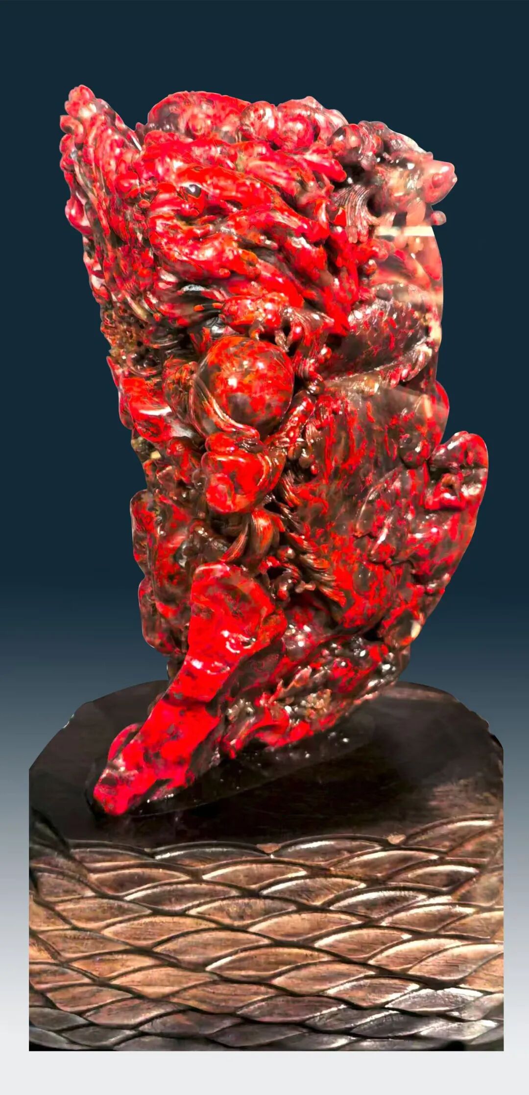 创作理念:作品依石形随色塑龙鱼交融之态,借血色浓处刻龙纹威仪,淡色肌理衬鱼形灵动,镂空工艺显空间层次,借夕阳红的贵气底色衬祥瑞之意。责任编辑:孟 曦