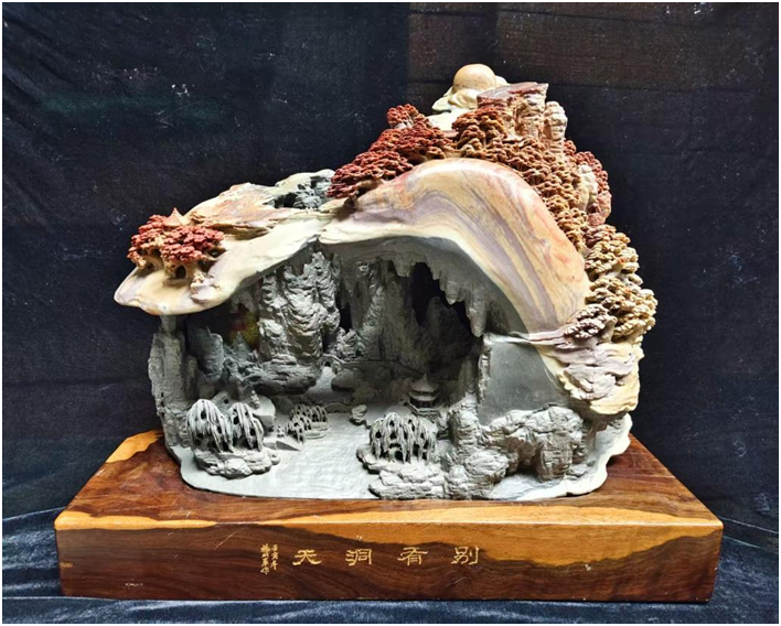 创作理念:作品由青田岭头多彩石雕刻而成的山涧溶洞图,洞内九曲回环,数不清的石像,亭阁造型千变万化,溶洞上方则为一片红叶,还有旭日东升之景色,宛如世外桃源,整副作品描绘了一副古朴,清幽的意境。▌《九龙凌云 寿山祥瑞》