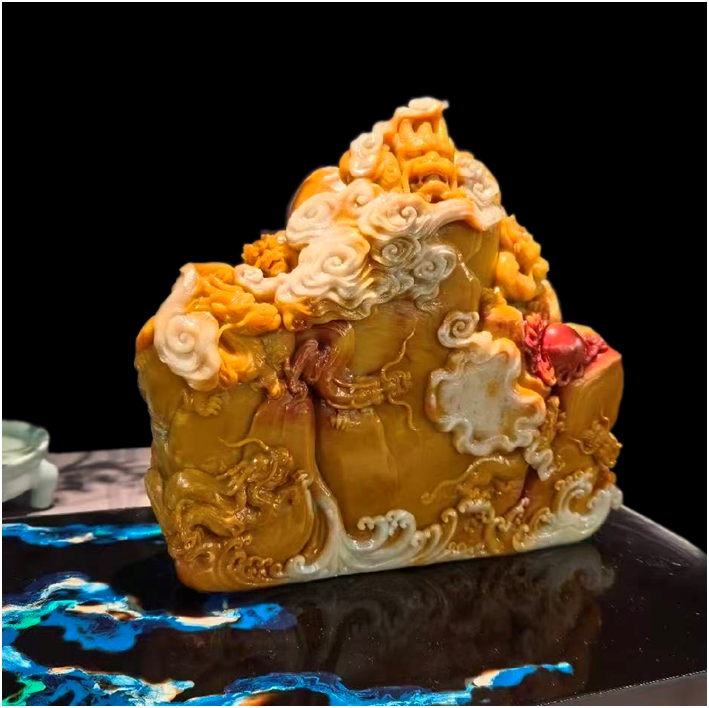 创作理念:作品精选寿山老岭通石雕琢而成,整体以山形为基底,白色部分被雕琢为朵朵浮云,缭绕于山形之间,在山与云的掩映处,九条龙若隐若现,一抹红色化作龙珠,底部则以水浪纹饰衬托,呈现出一幅龙腾云海、气宇轩昂的瑰丽图景。▌《千里江山》