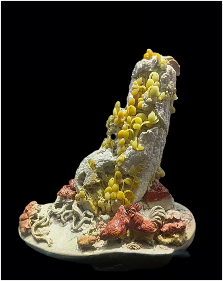 创作理念:作品主体雕琢出岩石肌理,其上以嫩黄巧色呈现出蓬勃生长的豆苗、花苞,藤蔓缠绕间尽显生命的萌发之力。底部的田园场景中,红褐相间的鸡群神态各异,公鸡昂首、母鸡啄食、雏鸡嬉戏,生动还原了农家院落的鸡群活力。作品将农耕文明里的生命律动与人文精神相结合,既是对田园生态的艺术摹写,也是对传统生活理想的诗意表达。▌《深山访友》