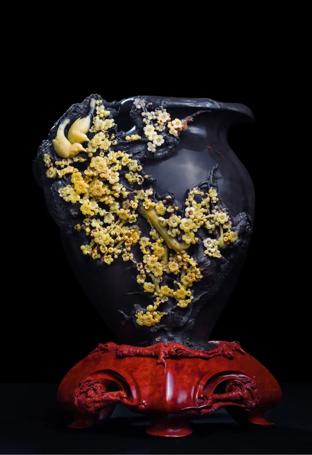 创作理念:作品包含多种雕刻技法,有镂空雕、圆雕、高浮雕、线刻等。以镂空雕刻为主要,立体写实的展现出自然景观的特色风貌。以石为纸,以刀为笔,将石材天然的纹理与色泽幻化成重峦叠嶂的山峰、错落有致的屋舍,黄色精雕而成的树木、花草等,远观有千里江山之磅礴气势,近赏有精雕细琢之灵秀神韵。▌《迎春瓶》