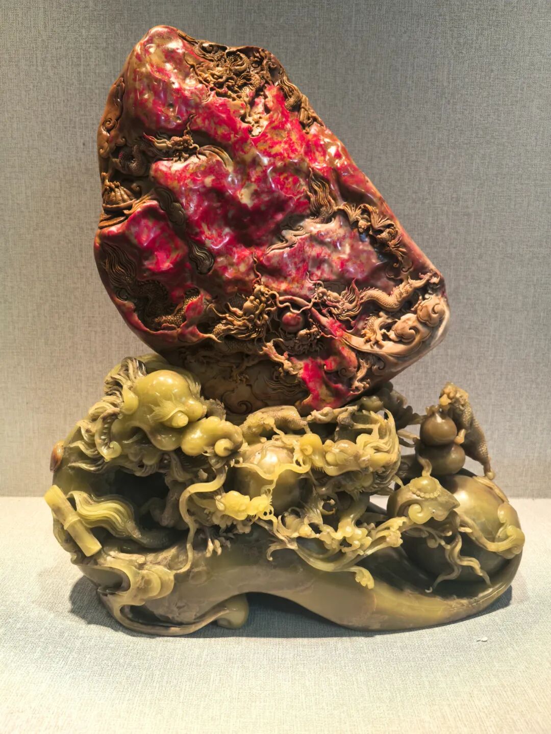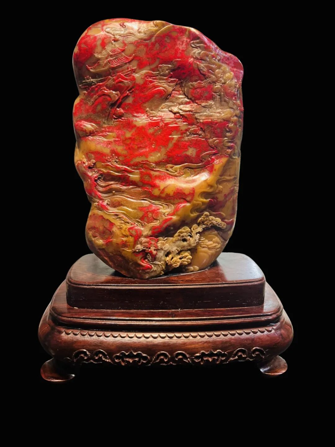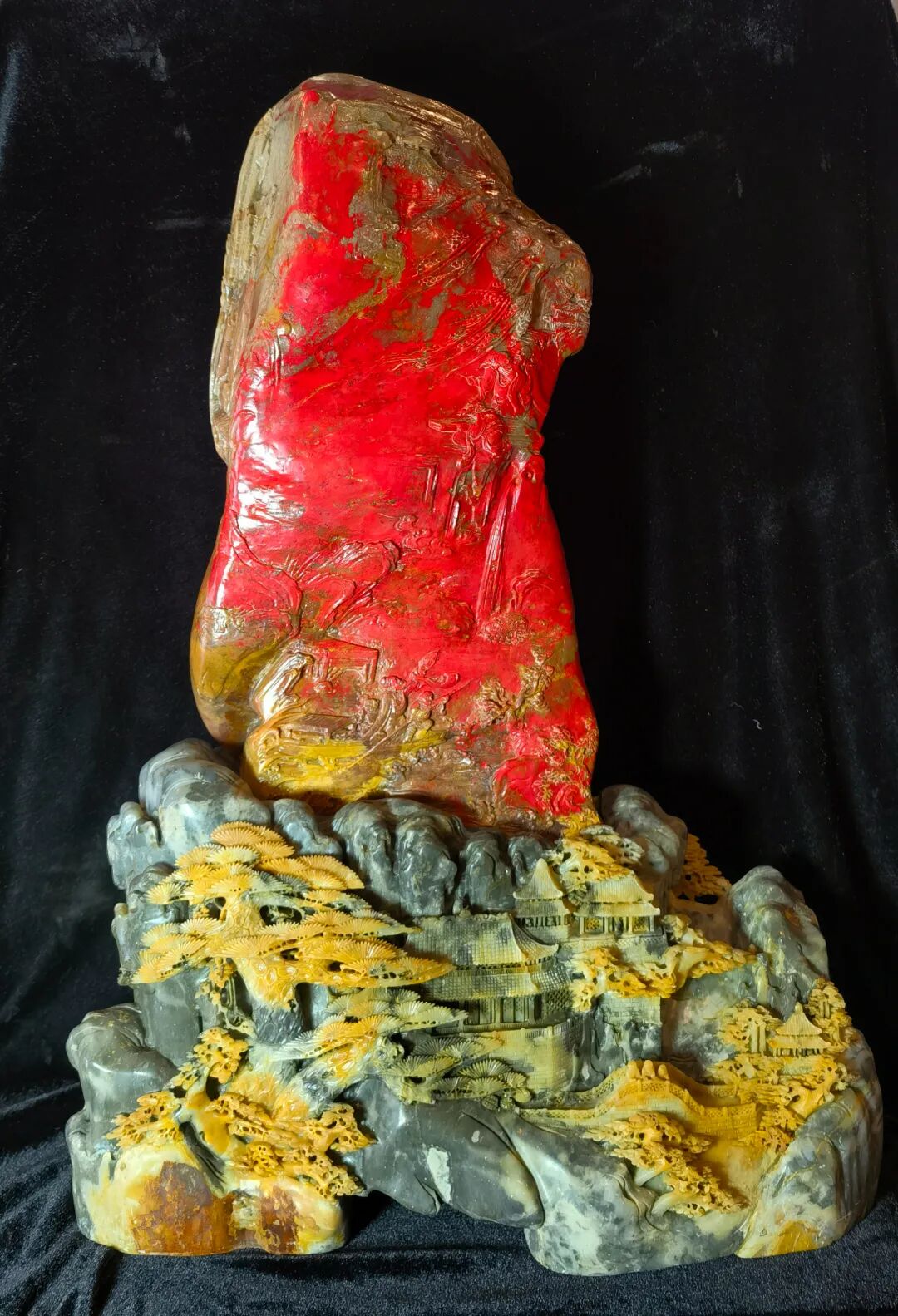 创作理念:作品因势造型,借红黄相间的天然石质,雕琢出一幅山水妙景,艳红鸡血似云霞漫卷,温润田黄若烟岚轻笼,亭台临流,古松迎客,流水悠悠,如世外秘境。其寓意在于展现远离尘嚣的世外胜境,寄寓着人们对宁静雅致、空灵脱俗生活的向往。▌《事事如意》