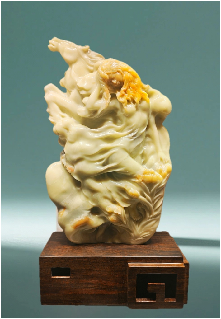 创作理念:作品借石质天然与俏色雕琢出金发少女在原野中的刹那。其发丝夜裙飘现于流转的石纹中,线条随风势起伏,石面留白似云雾蒸腾,将“梦境”的缥缈感与“奔马”的力量感凝于一体,“天马行空”的不羁,表现了当代人以理想为舟、破浪前行的精神图景。责任编辑:孟 曦