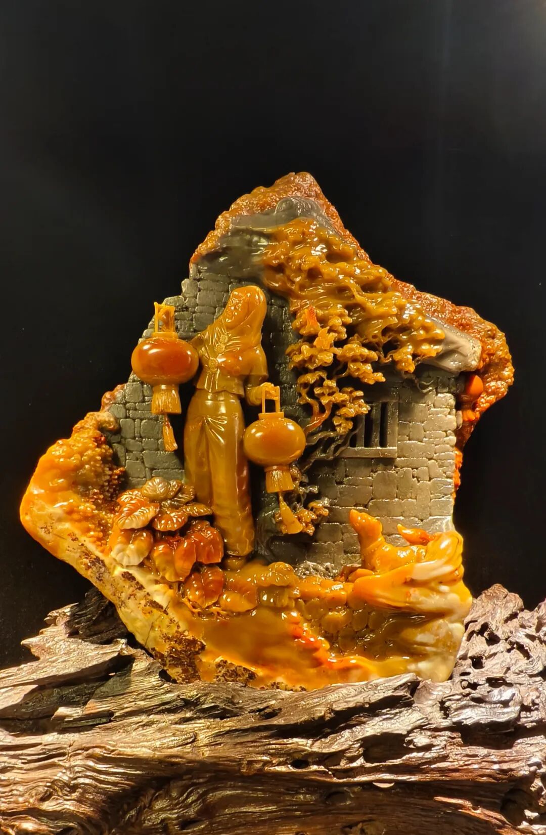 创作理念:作品高50厘米、宽55 厘米、厚20 厘米,选用昌化五彩冻石作为载体,塑造出人物、灯笼、房屋、树木等不同元素的质感差异,塑造出人物、灯笼、房屋、树木等不同元素的质感差异。