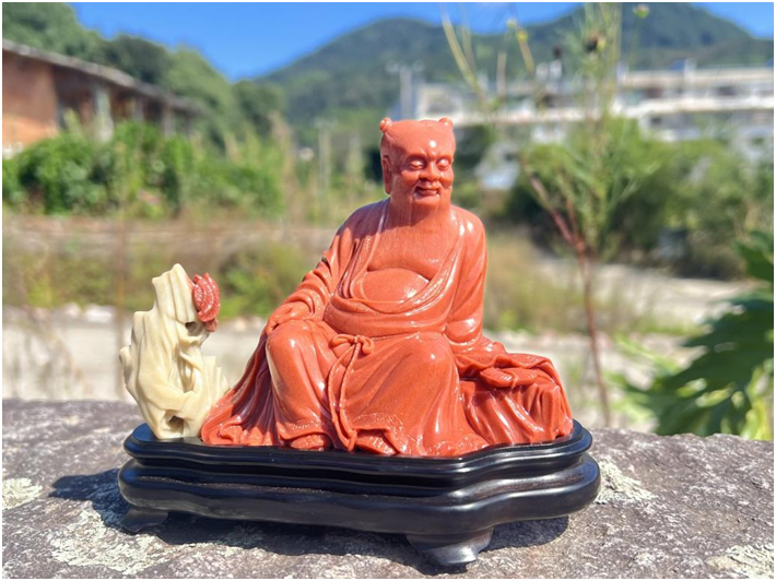 创作理念:作品运用多种技法营造出树木、楼宇、屋室、山道、江水、扁舟、赤壁的峭壁,生动还原出“大江东去,浪淘尽”背景下,苏轼与友人夜游赤壁的场景。整体雕镂相济,繁简结合,充分保留石材固有的特色,展现人文与自然和谐共存的美丽画卷。▌《正阳祖师》