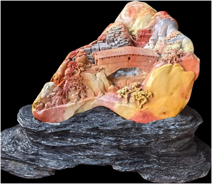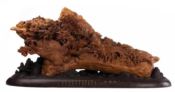 创作理念:作品采用天然造型的檀香木为载体,运用精微透雕、圆雕、镂空雕等技法,在方寸中雕琢六层镂空景致,层层递进却互不粘连,亭台飞檐斗拱榫卯分明,窗棂纹路细如发丝。人物十八贤士或执卷吟诵,或品茗论道,衣袂流转自然,神态眉眼栩栩如生,山与景之间山石嶙峋层叠,松枝虬曲苍劲,云气缭绕其间。《海茗扬帆》