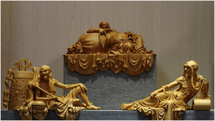 创作理念:作品以黄杨木为材,精雕三位罗汉形象。左侧罗汉倚古钟、持杖,神态诙谐;中间布袋罗汉坦腹斜卧,笑意盈盈,佛珠随身;右侧长眉罗汉悠然侧卧,形神不羁;通过木雕的刀痕肌理,尽显罗汉衣褶的飘逸灵动与身形的迥异神态,晕染出禅者不拘形迹的自在。《濨音翩图》