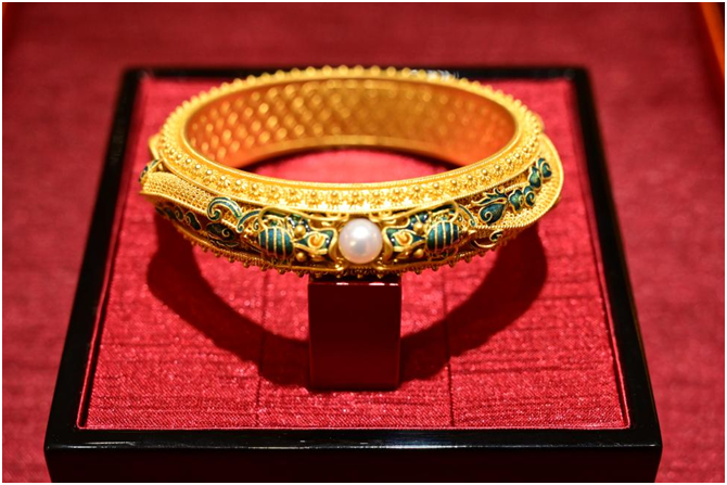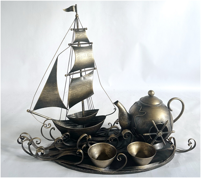 创作理念:作品以鼓起风帆的帆船为主体元素,帆船造型逼真,风帆线条流畅,仿佛正乘风远航。旁边搭配一只精致的茶壶与两个茶杯,茶壶细节丰富,壶身设计独特,茶杯小巧玲珑。底部以铁线造型勾勒出波浪形态,生动展现海洋的汹涌澎湃。寓意“一带一路”开启新的征程与希望。《四龙戏珠手镯》