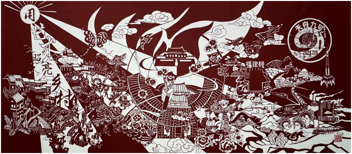 创作理念:作品画面中央,田螺坑、土楼群依势而建,其上高擎一把熊熊燃烧的火炬,寓意乡村振兴的蓬勃生机。古雅的建筑群落与“天舟九号”、“福建舰”等现代科技元素交相辉映,展现传统与创新的对话;“照亮乡村”的标语与遍布画卷的民间乡村风俗相映成趣,勾勒出人与自然和谐共生的美好图景。《初心筑就富民路》