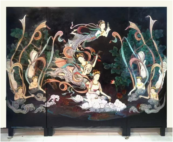 创作理念:作品以敦煌飞天为灵感,展现“普劝图”的劝化意蕴。采用漆画工艺,在黑色漆底上营造出绚丽色彩与细腻纹理。飞天姿态灵动,飘带、花叶栩栩如生,整体画面富有层次感与装饰性,既传承敦煌艺术神韵,又借漆艺的厚重质感,呈现出典雅庄重且极具视觉冲击力的艺术效果。《十八学士——登瀛洲》