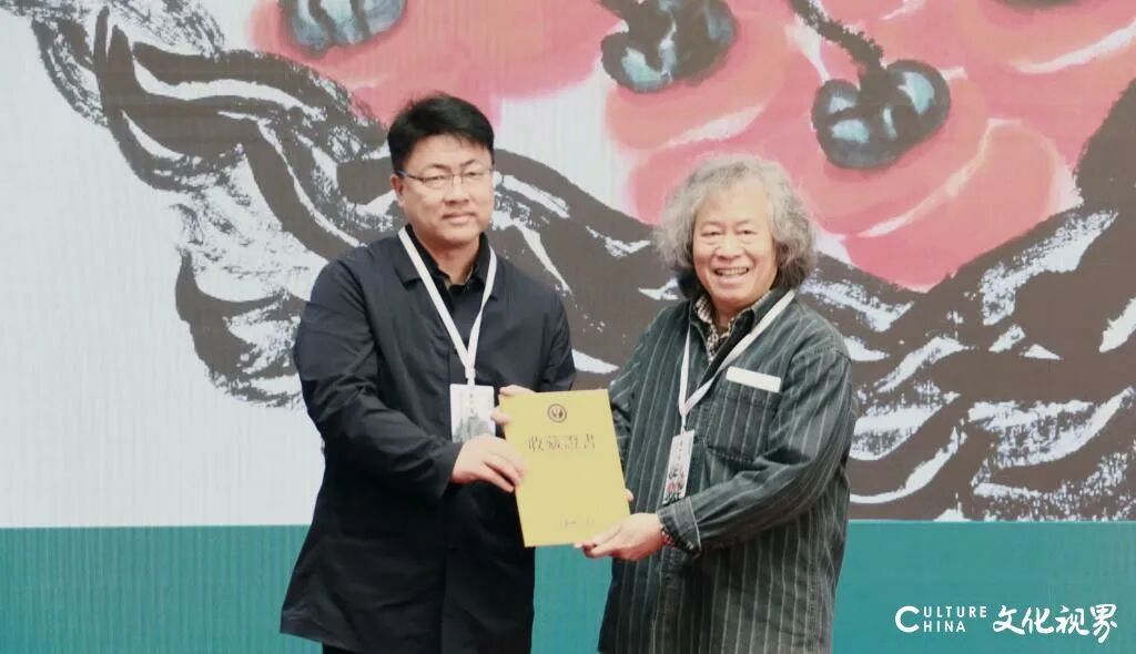 开幕式上,还举行了隆重的作品捐赠仪式。唐绪祥教授向山东工艺美术学院美术馆捐赠了多件艺术作品,美术馆馆长张培源代表学校接受捐赠,并向唐绪祥教授颁发了收藏证书,以感谢其对学校艺术教育事业和美术馆建设的无私奉献。